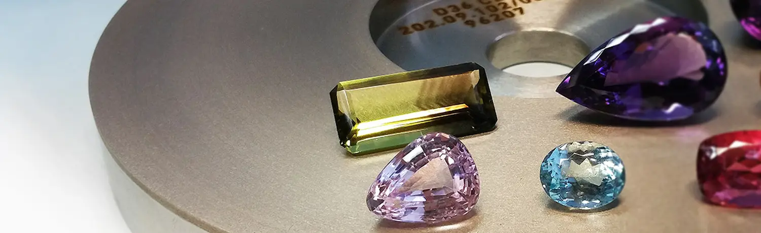 Schleifwerkzeuge mit individuellen Profilen und Abmessungen von bis zu 400 mm Durchmesser, segmentierte Sinter-Trennscheiben mit Durchmessern von bis zu 2300 mm, galvanische Trenn- und Schleifwerkzeuge bis zu 1000 mm Durchmesserumfang und mechanische Trennscheiben bis zu 1500 mm Durchmesser. - Welche, seit ihrer Entwicklung 1939, ein für Edelsteinschleifer unverzichtbares Trennwerkzeug zur Bearbeitung von Edelsteinen und Mineralien sind.